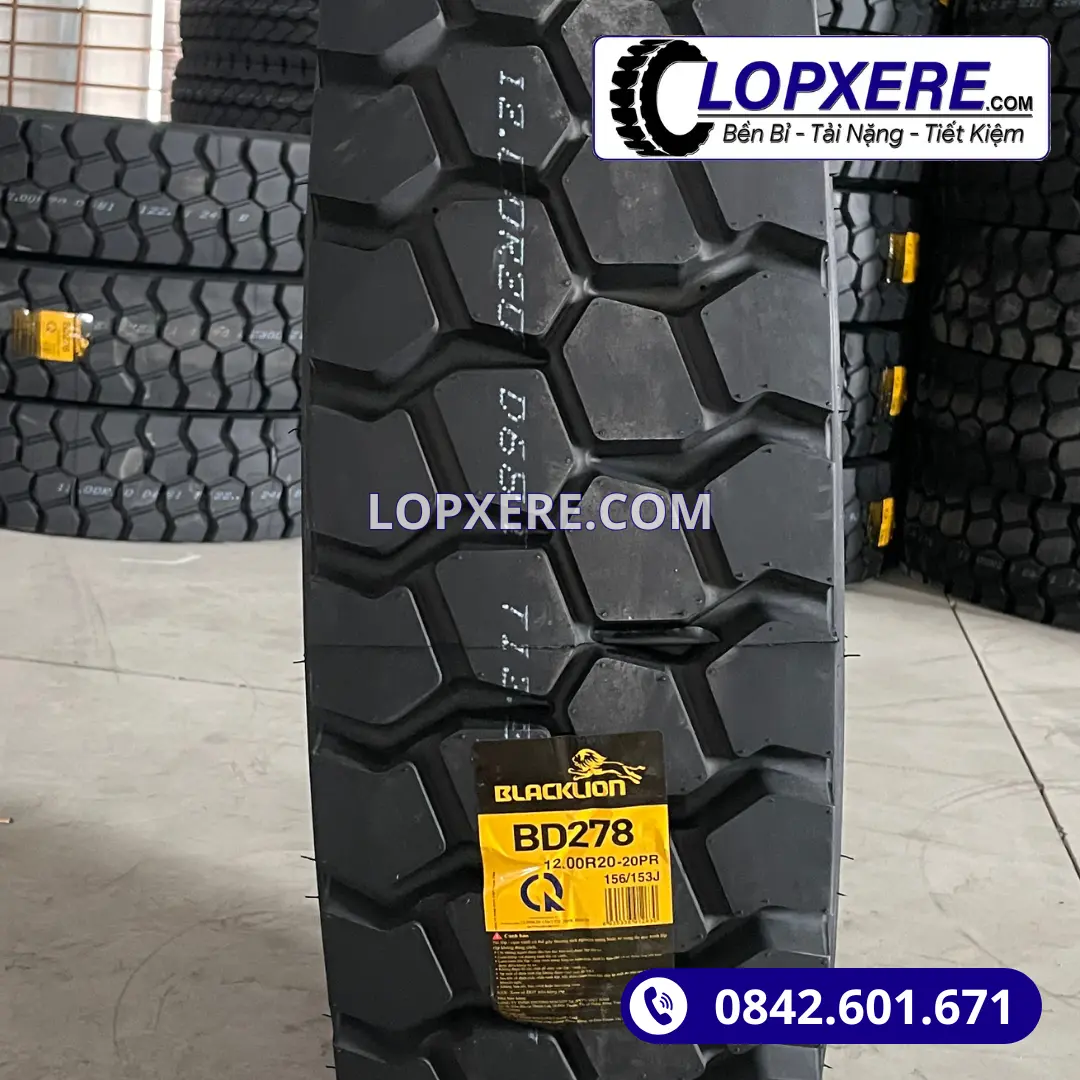 Lốp Blacklion BD278 12.00R20 là sản phẩm lốp xe cao cấp thuộc thương hiệu Blacklion. Lốp xe tải BD278 được sản xuất bởi nhà máy Jinyu và được sử dụng phổ biến cho các dòng xe tải, xe công chở hàng nặng hoặc đi đường xấu. Vì là lốp xe gai ngang nên lốp xe tải Blacklion BD278 giúp mang lại sự khoẻ khoắn, lì đòn trên những cung đường xấu. Kết cấu bố thép với 20 lớp bố giúp cho lốp xe BD278 có khả năng chịu tải cực lớn, vượt tải lên đến 220%.